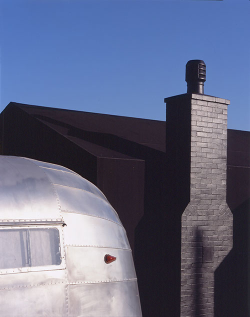 Internally priority has been given to maximising the living areas and the house only has one small bedroom. Visitors are accommodated in a 1954 Airstream caravan which is parked next to the house, the silver of the aluminium caravan providing a striking visual contrast to the black rubber.