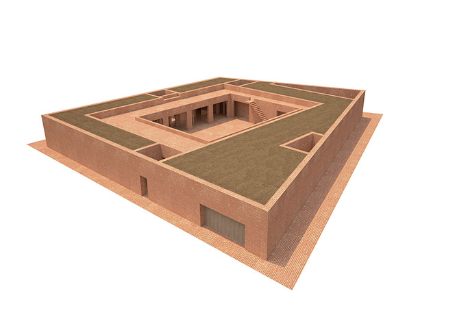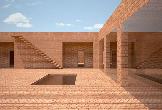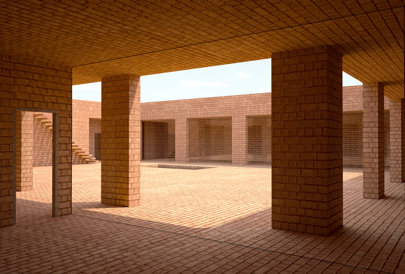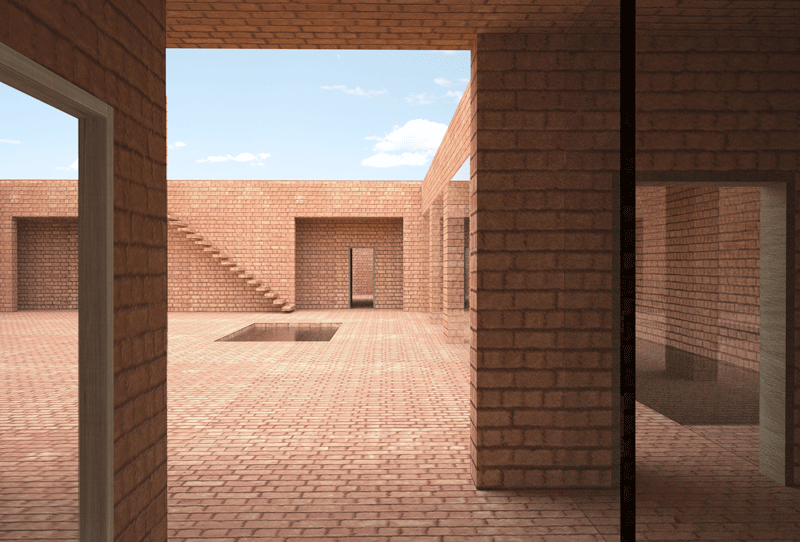 The 'Courtyard' house was one of two designs we developed for this project. It is loosely based on the Mongolian farmsteads we saw on our visit to Ordos, simple, single storey, residential and agricultural buildings grouped around a courtyard to provide some shelter from the hash winter and summer conditions.