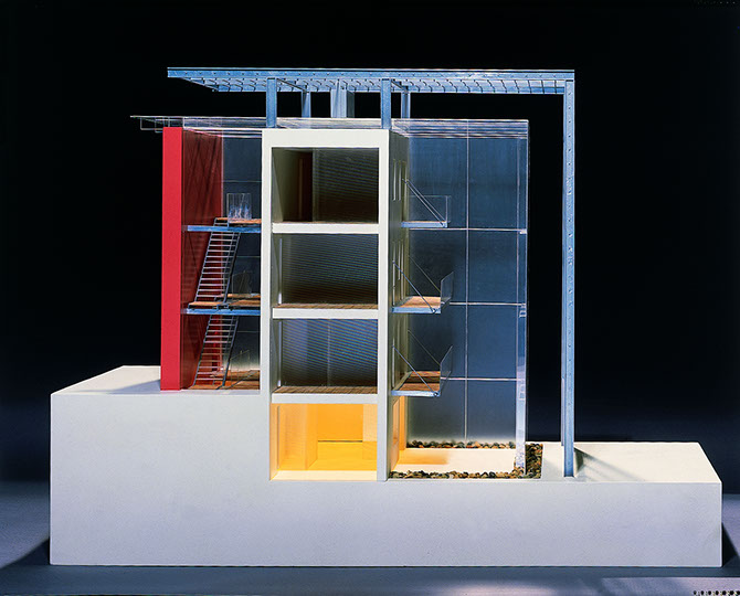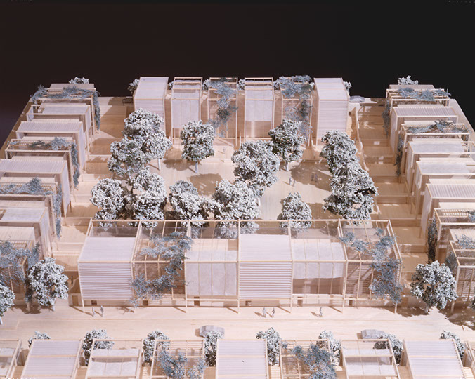 The basic four storey house is made up of a simple laminated glass box which provides the main living space and makes the most of the potential for solar gain, and a highly insulated core structure which contains the kitchen, bedrooms and bathrooms, and is made of pre-fabricated concrete panels, their thermal mass reducing the impact of rapid changes in external temperature. Internal walls are non-load bearing so that space can be rearranged easily. The basic house can be combined in various ways to form streets and squares.