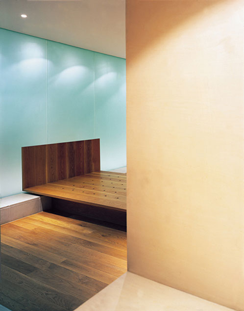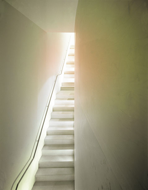 In addition to the natural light from above the different levels of the house are linked together by a flight of tapering stone steps which lead directly from the front door at street level up to the second floor living area, and by a three storey storage wall which both defines the staircase and separates it from the accommodation at first and second floor levels.