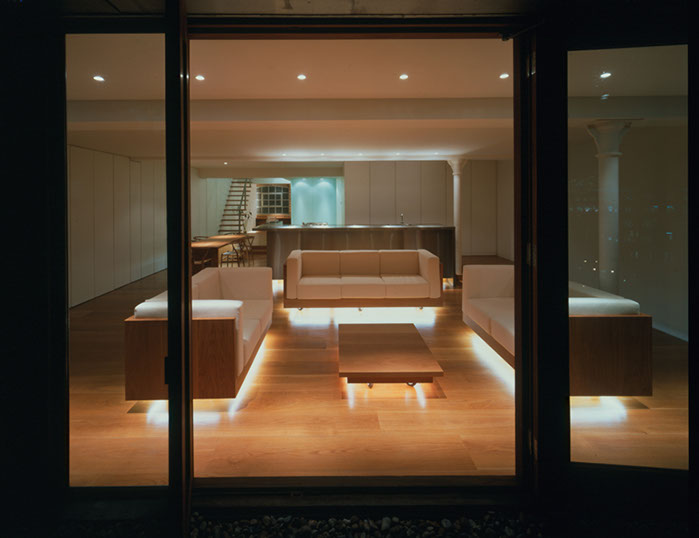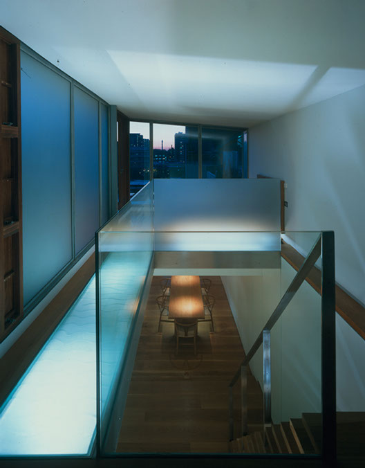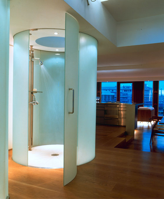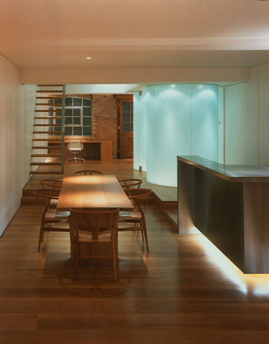 The main area was defined by three free-standing elements, a stainless steel kitchen and two translucent glass drums. One of these drums contains a shower and the other a WC and basin. If the doors of the drums are left in their open position they can be used to form a conventional bathroom. Both drums are naturally lit during the day through translucent glass rooflights and at night the lit drums themselves provide the main light source for the space.