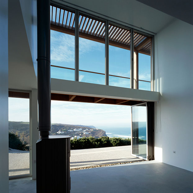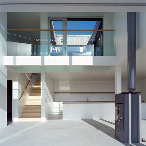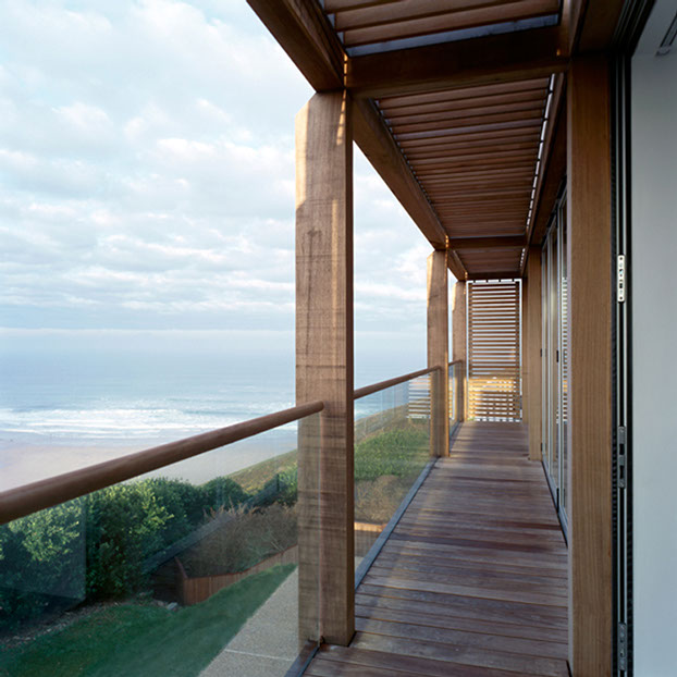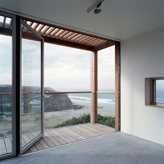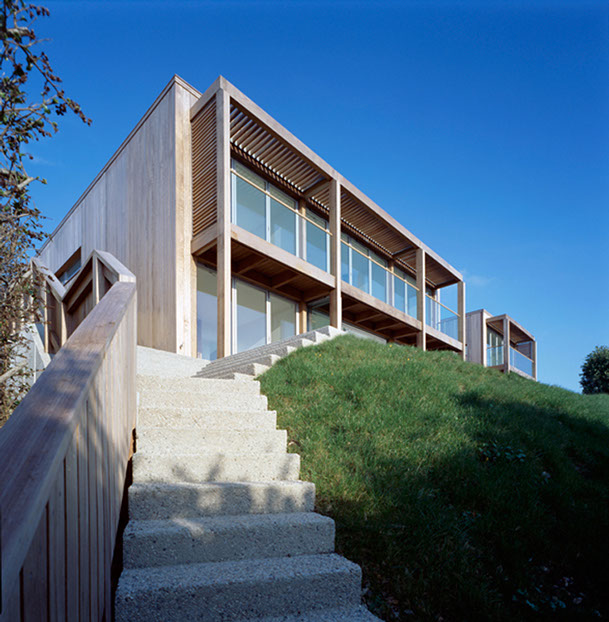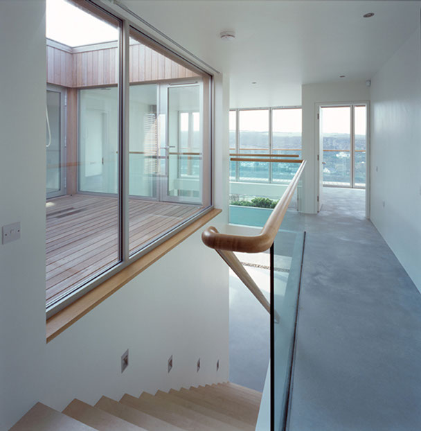 Both buildings rely on passive solar gain as their primary source of heating, and this is reflected in the use of highly insulated masonry walls, concrete floors and roof. The south west elevations, facing the views, are fully glazed to capture the solar gain during the winter, but the full width balconies and brise soleil will prevent overheating in the summer.