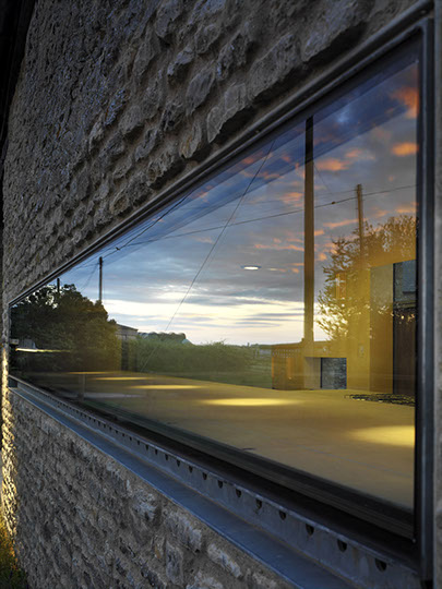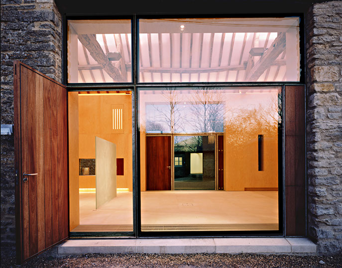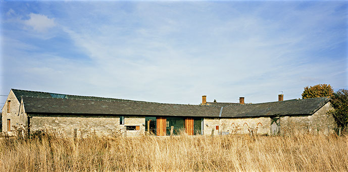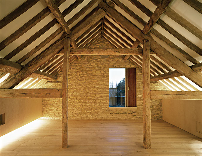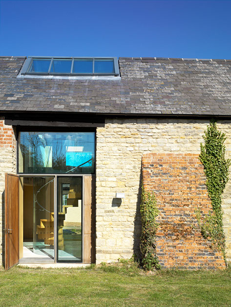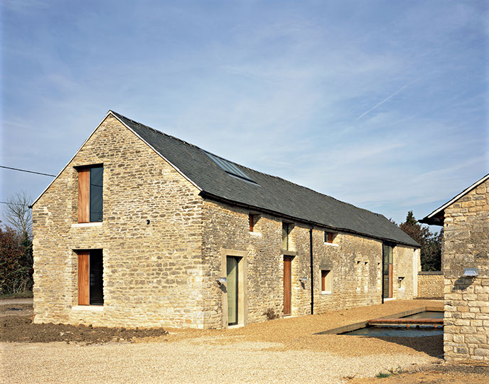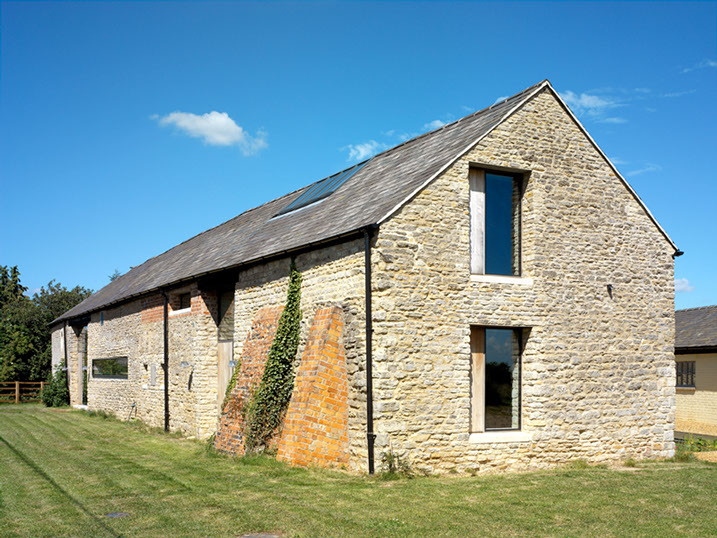 A group of redundant farm buildings in Buckinghamshire have been converted into a large family home. The buildings stand in an elevated position in open countryside with fine views over the surrounding countryside. The three buildings - a large stone barn, a smaller brick and stone barn and an open sided steel framed shed - form a triangular courtyard, a sheltered space on this relatively exposed site.