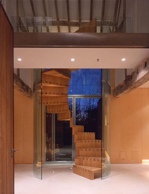 The other part of the larger barn was always on two levels and these have been retained to provide a large ground floor hallway, and a double height central space containing an innovatory circular oak staircase. This staircase leads to a bridge which links the two bedrooms at first floor level. The smaller barn is used by the children, and incorporates a large living and play space, two large bedrooms and a bathroom. This building also incorporates a garage.