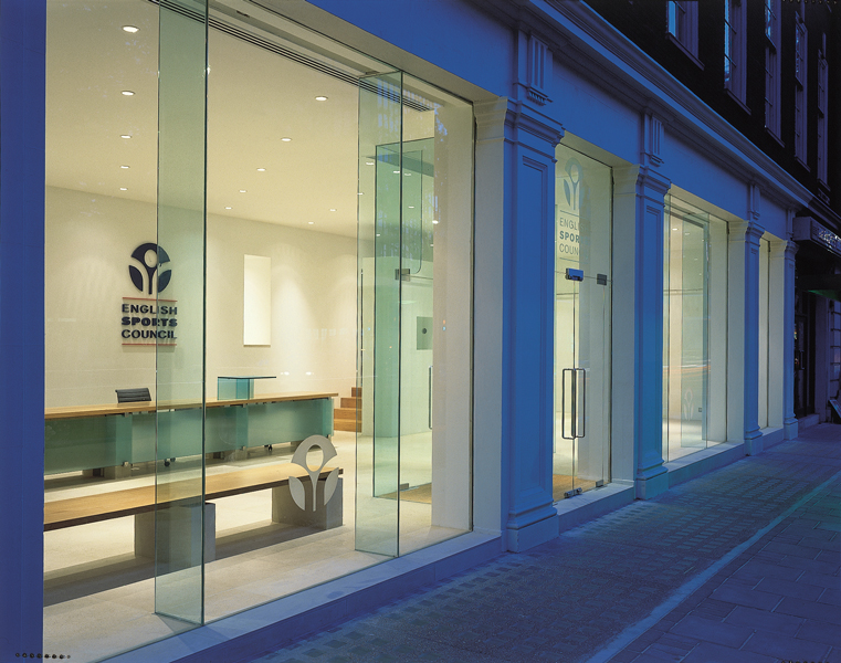 This project, for the newly established English Sports Council, involved the extension and refurbishment of the ground floor of their headquarters in central London. In addition to rationalising the use of the area our scheme took advantage of the long street frontage to identify the presence of the organization and communicate its function to the passing public.