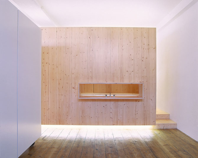 As a consequence the shell space was not subdivided into separate rooms but essentially left as one volume. The rear wall is lined with a white storage wall which accommodates the main services and the built in storage. The main space is defined by a free-standing linear box which contains the kitchen as well as separate bath, shower, WC and basin compartments. These compartments can either be used separately or, if the bath and WC doors are left in their open position, collectively to form a conventional bathroom.