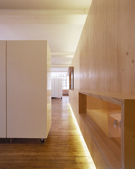The large open plan area in front of the box, is divided into three areas by two mobile storage units. The area adjacent to the bath compartment is used for sleeping and the area in front of the kitchen is a combined dining and living area. The third area is used as a study.