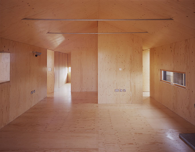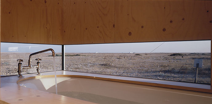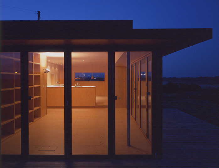 The original building itself is the product of a series of changes and extensions since it was built as a fisherman’s hut in the 1930s. It has been stripped back to its timber frame, extended to the south and west to capture the views and clad both internally and externally in spruce plywood. This plywood provides all the internal finishes, including walls, floors, ceilings, doors and joinery. Externally both walls and roof are clad in black rubber, a technically more sophisticated version of the layers of felt and tar that are found on many of the existing buildings. One of the best views is from the bath which is cantilevered out over the beach to give dramatic views to the south and west.