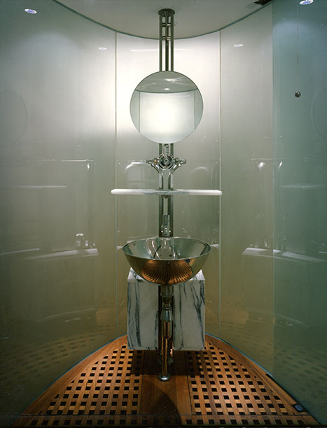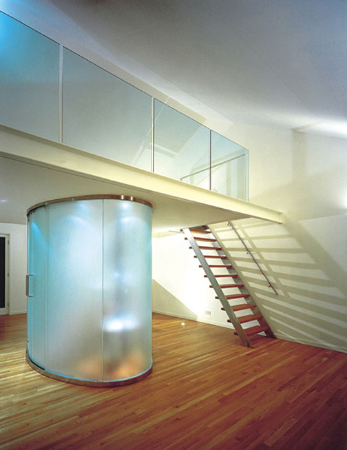 Below the gallery there is a free standing oval, translucent glass bathroom containing a shower, basin and WC. Its central location provides a degree of separation between the study area at the rear and the larger living space at the front of the property. At night the internally lit glass oval also provides the primary light source for the space as a whole.