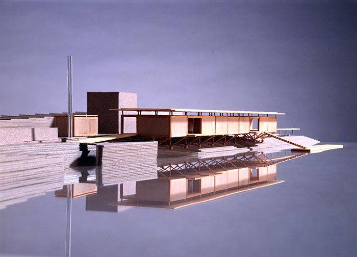 A competition entry for a new educational centre for a wetlands ecology park in London Docklands. The site was the polluted Limmo peninsular on the River Lea and function of the Centre was to demonstrate how soil can be cleansed naturally by water and plants. The competition brief defined a fast track construction programme and a tight budget.