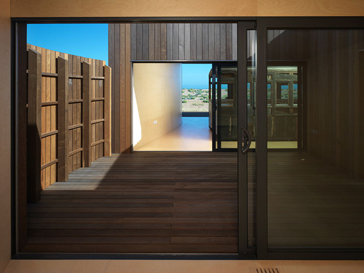 The sloping roof deck acts as an observation platform with extraordinary 360 degree views of the beach and the sea. The plan incorporates two courtyards to provide shelter from the constant wind.