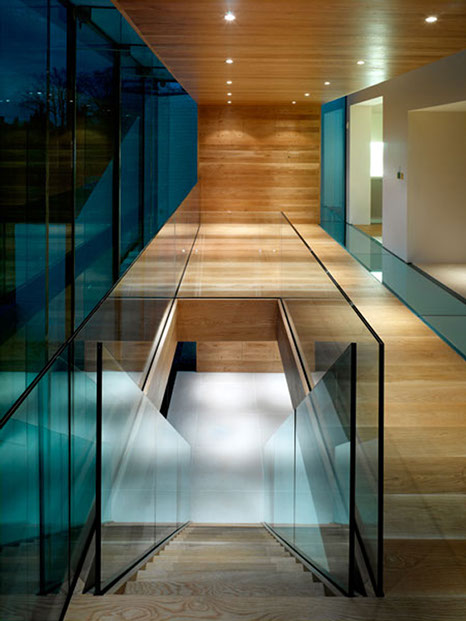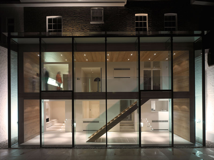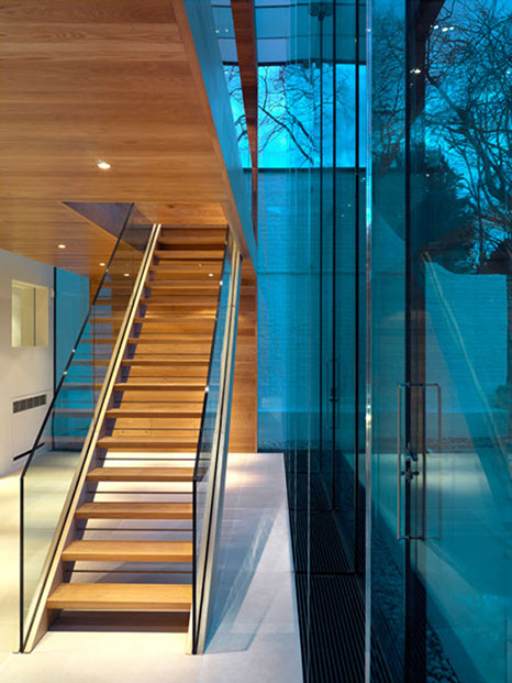 The double height walls facing the garden are made up of double glazed panels 6 x 1.6 metres in size. The solid sections of the roof and side walls are constructed as a heavily insulated steel timber frame clad internally in oak and externally in white render. A 600mm strip of the roof and side walls immediately adjacent to the original house is glazed to provide a clear visual break between new and old and maximise natural lighting in the main house.