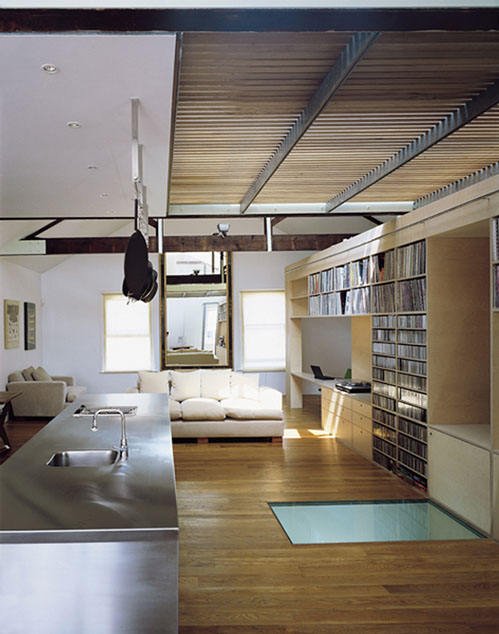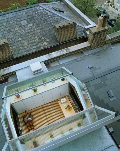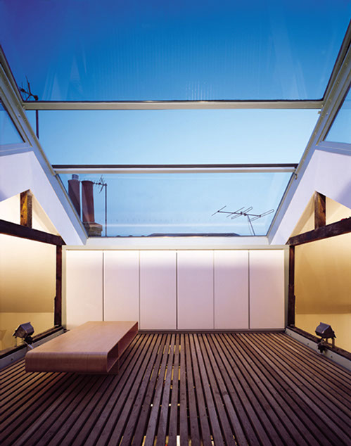 This potential was realised by inserting a roof top conservatory in the centre of the plan, which can automatically retract in good weather to create an open roof terrace. The steel and glass structure allows sunlight to flood down into the centre of the second floor living area, and a section of glass floor at this level also allows light to penetrate down to the first floor hallway below.