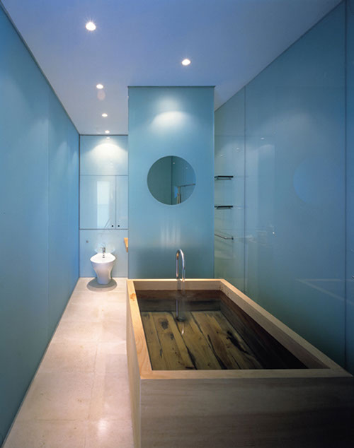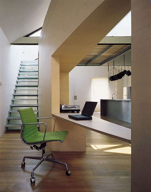 In addition to the natural light from above the different levels of the house are linked together by a flight of tapering stone steps which lead directly from the front door at street level up to the second floor living area, and by a three storey storage wall which both defines the staircase and separates it from the accommodation at first and second floor levels.