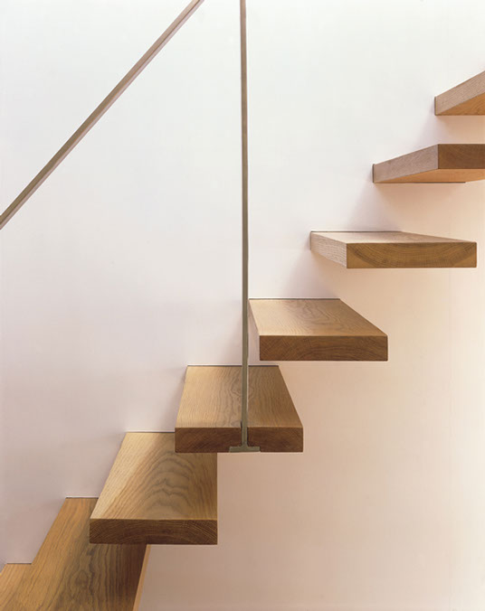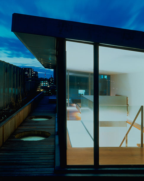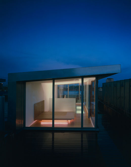 The main area was defined by three free-standing elements, a stainless steel kitchen and two translucent glass drums. One of these drums contains a shower and the other a WC and basin. If the doors of the drums are left in their open position they can be used to form a conventional bathroom. Both drums are naturally lit during the day through translucent glass rooflights and at night the lit drums themselves provide the main light source for the space.