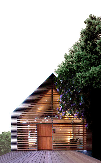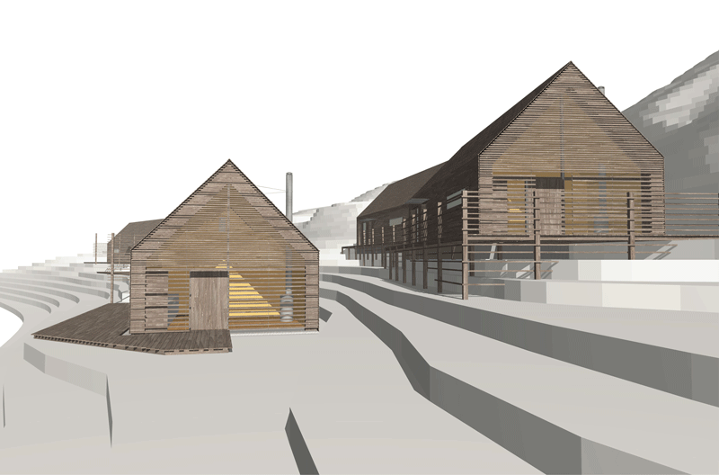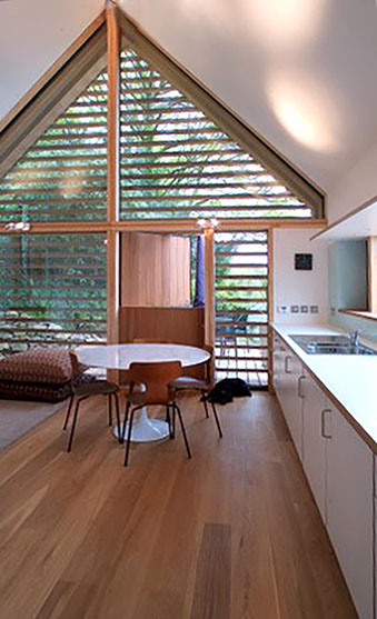 The houses are prefabricated as lightweight, heavily insulated, timber- framed panels and assembled on site. Walls and pitched roofs are then clad externally in horizontal FSC hardwood boards left to weather naturally to a silvery grey.